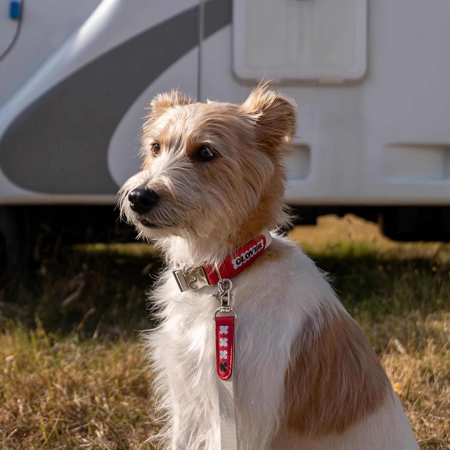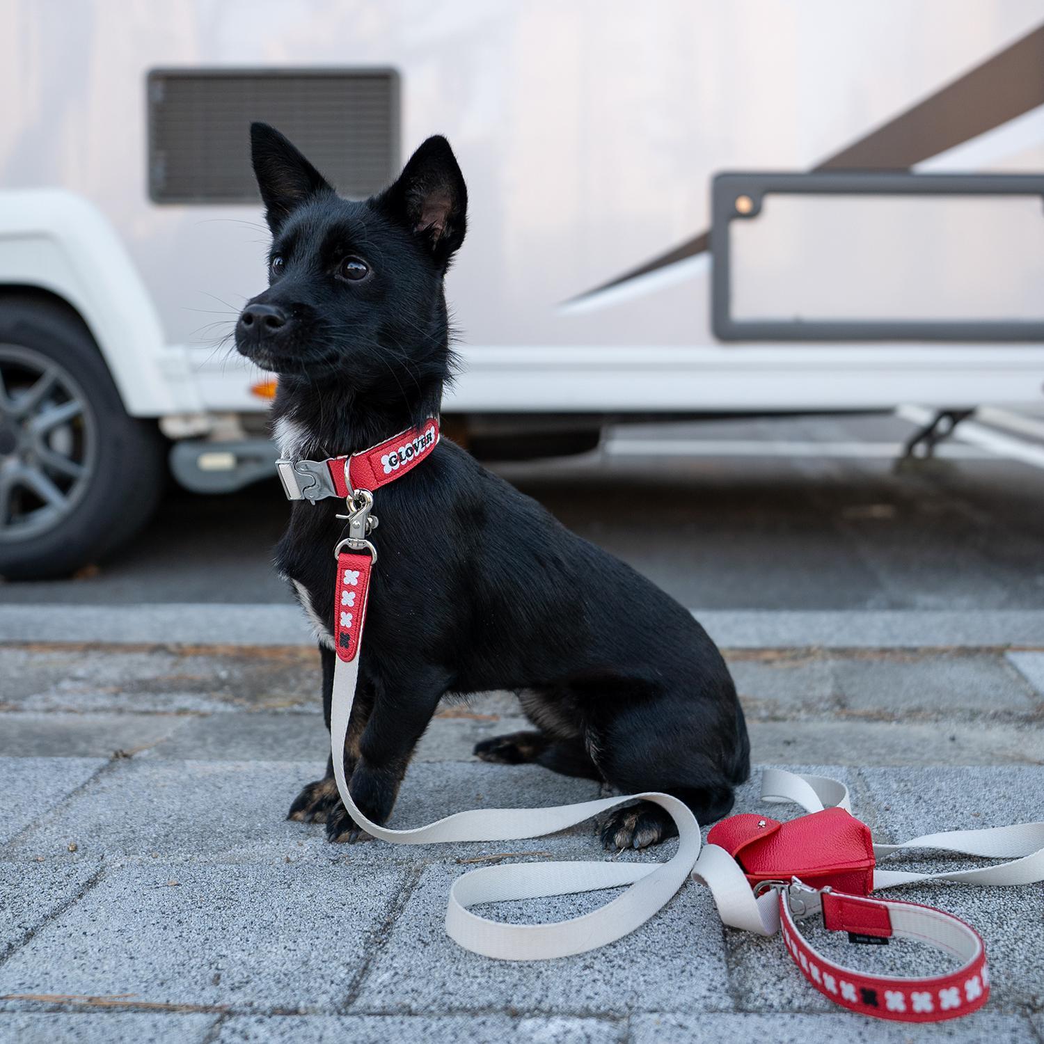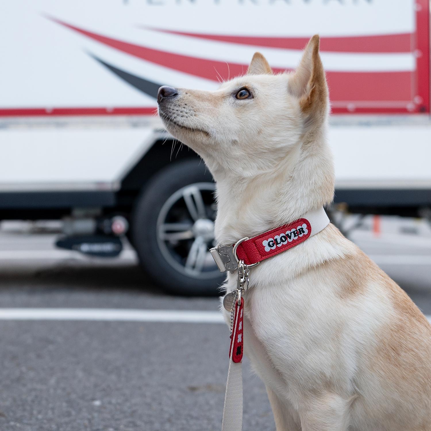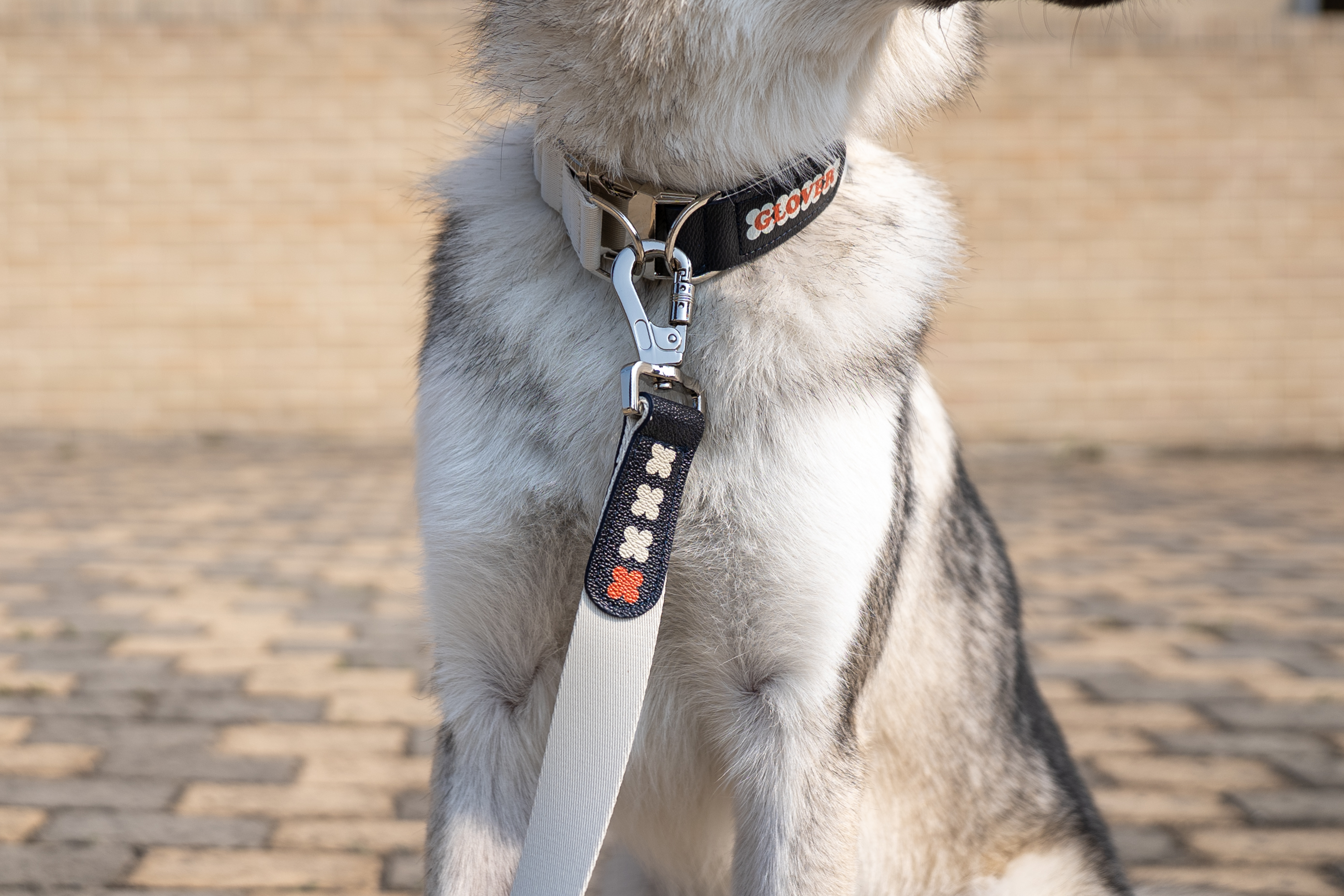 GLOVERのロゴレタリングを配色で施し、クローバー型のペンダントをあしらったレタリングリーシュは、